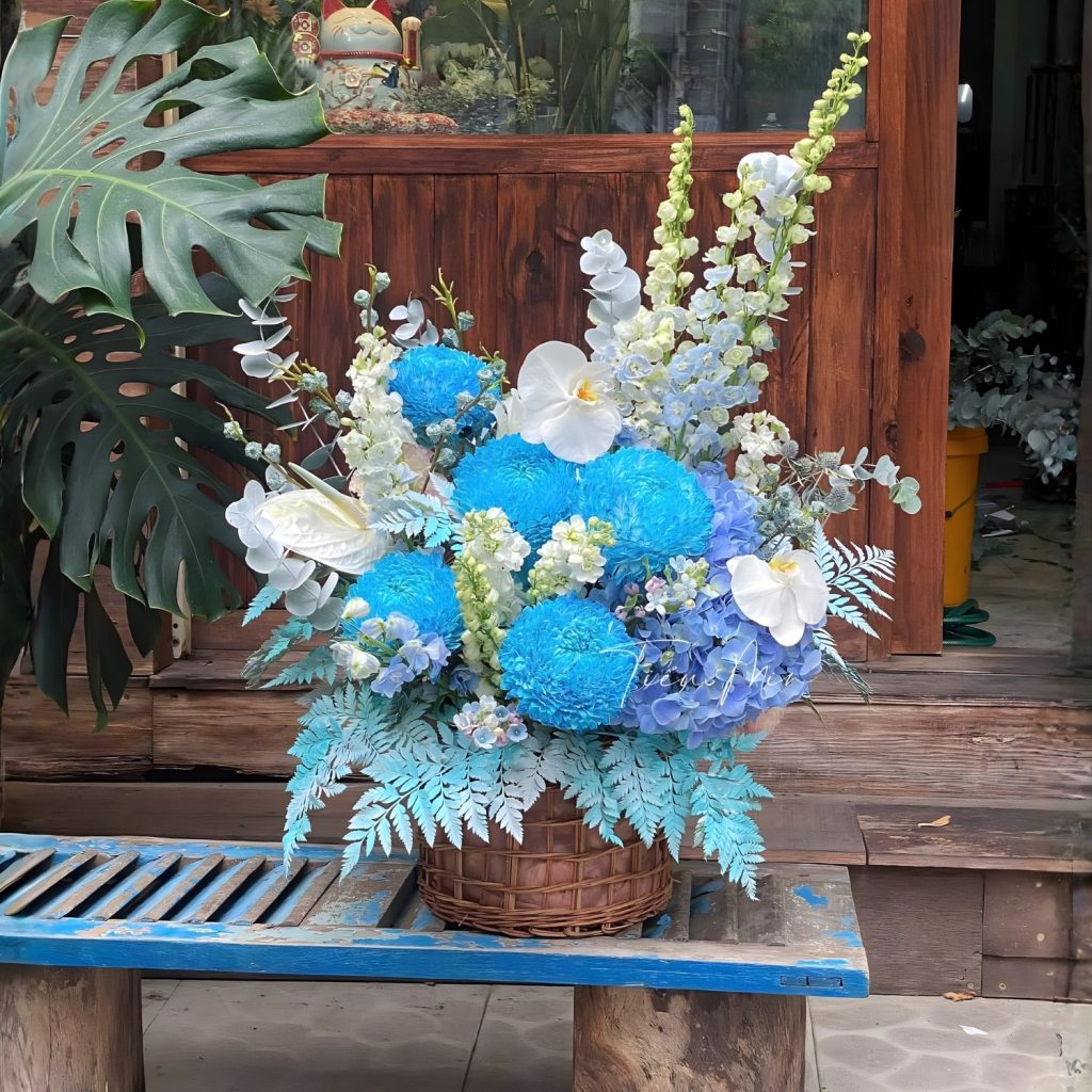 Những bông hoa được kết hợp khéo léo tạo nên một bó hoa sang trọng, với sự tươi mới của màu sắc và sự quyến rũ của các loại lá phụ, đảm bảo tạo nên một tổng thể hài hòa và ấn tượng. Màu sắc của bó hoa này chủ yếu là màu trắng của lan hồ điệp, xanh dương của sao xanh và delphinium, cùng với màu tím nhẹ nhàng của cẩm tú cầu và phi yến, mang đến một vẻ đẹp thanh thoát nhưng vô cùng lôi cuốn.