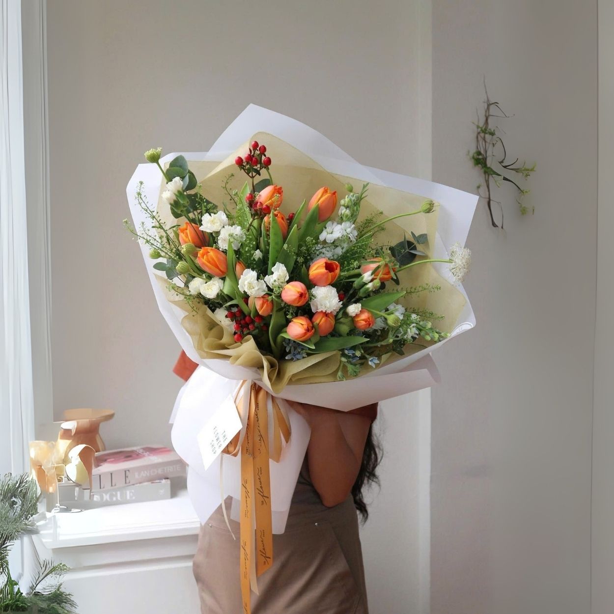 Tulip luôn có cách chạm vào cảm xúc bằng nét đẹp thẳng thắn và rất mực thanh lịch. Whatever lấy sắc cam làm tâm điểm, sáng bừng ngay khi người nhận mở bó. Mỗi nụ tulip được đặt cao độ khác nhau để tạo nhịp chuyển động tự nhiên, tựa một khung hình đang nở dần. Cạnh đó là những bông cẩm chướng trắng mềm mịn làm lớp đệm dịu mắt, giúp tổng thể cân bằng và tinh tế. Chuỗi ngọc đỏ điểm xuyết như hạt nắng vương trên cành, vừa tăng chiều sâu vừa khiến bố cục trở nên sinh động hơn.