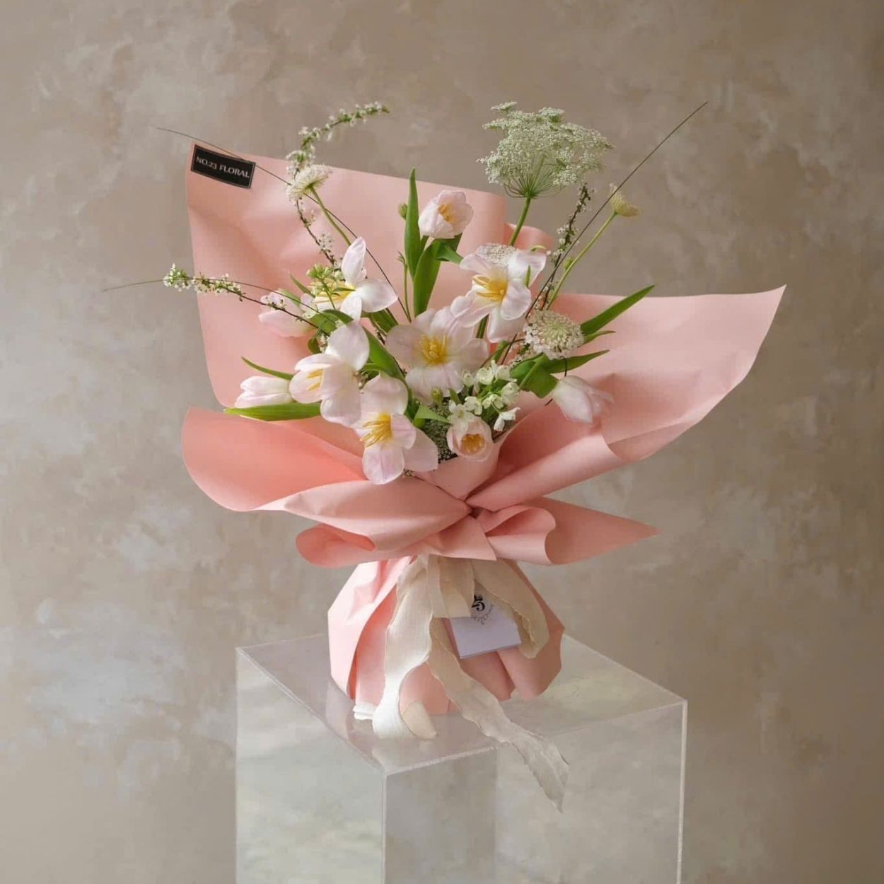 Giấy gói hồng phấn dày dặn được xếp thành các lớp bồng bềnh ôm khít phần cuống, kết bằng chiếc nơ vải mềm tạo điểm nhấn thủ công. Toàn bộ bố cục theo hướng mở, có khoảng rỗng vừa đủ để mắt được nghỉ, giữ cho bó hoa đúng tinh thần garden style hiện đại.