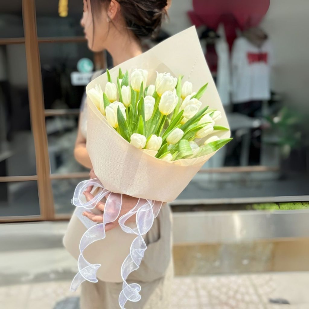 Tên “Winifred” gợi nhắc “niềm vui hiền hòa”. Bó hoa này hướng đến người nhận yêu sự tinh gọn, coi trọng trải nghiệm hơn phô trương. Tulip trắng không ồn ào; chúng mời bạn chậm lại nửa nhịp để thấy vẻ đẹp của điều đơn giản: chiếc nơ trong veo, gân lá xanh mướt, và sự ngay ngắn của các cánh hoa khi vừa hé nở.
