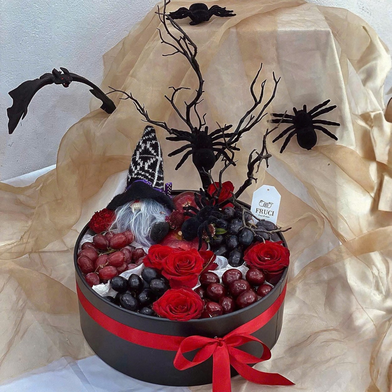 Một chiếc hộp đen tròn, nơ đỏ rực như vệt son giữa đêm. Bên trong, nho tím – đen phủ bóng, táo đỏ căng mọng, những bông hồng Ecuador đỏ thẫm xen scabiosa mận chín. Tất cả dựng hình dưới các cành khô vươn cao, vài chú nhện nhung đậu nhẹ như lời thì thầm của mùa lễ hội. “Witch’s hat” không chỉ là giỏ hoa trái cây, mà là một sân khấu Halloween thu nhỏ – nơi màu sắc, chất liệu và hương vị cùng kể một câu chuyện.
