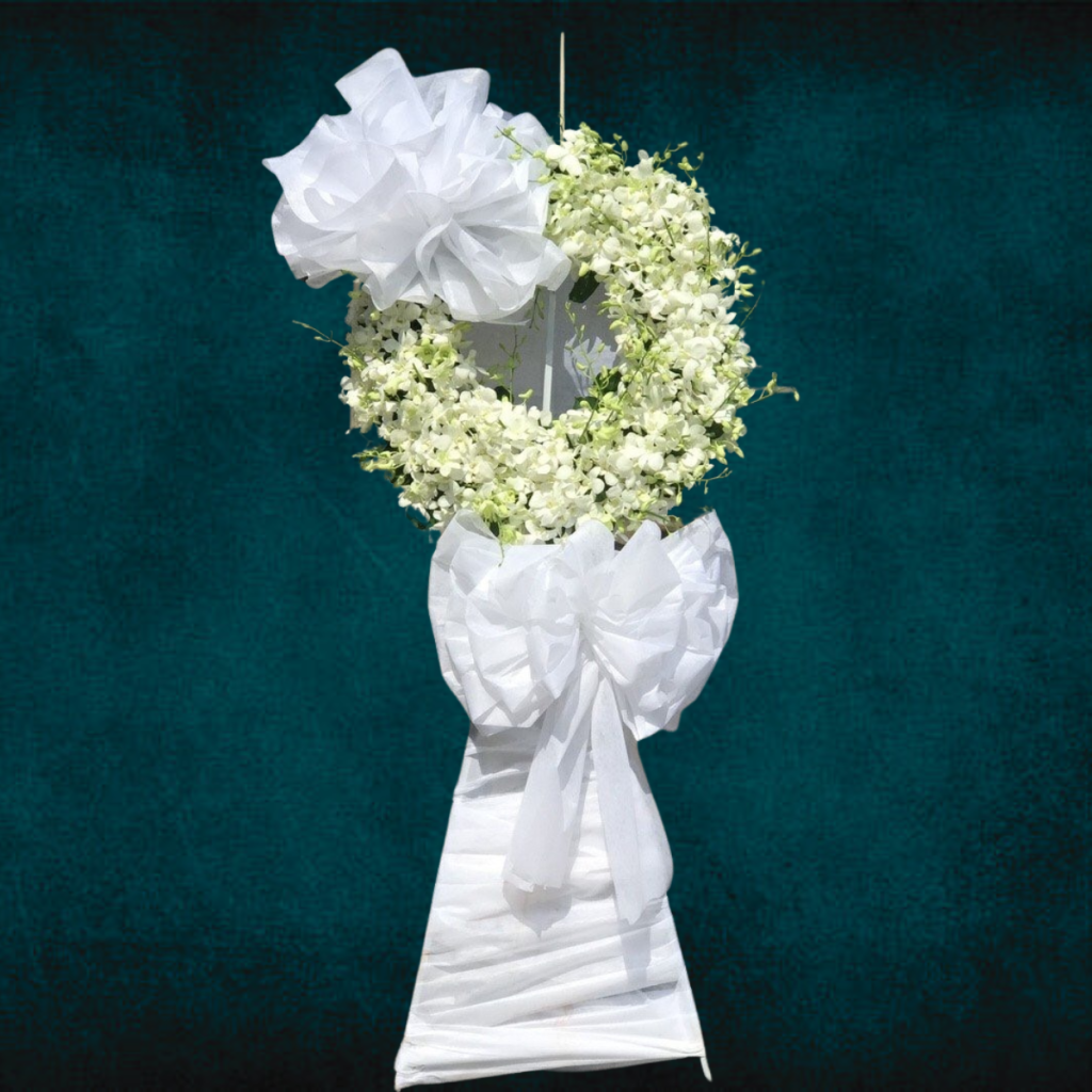Kệ chia buồn With Sympathy là sự kết hợp giữa hoa lan thái trắng tinh khiết, lá chanh xanh mướt, nơ trắng dịu dàng, và vân long trắng trang nhã. Mỗi yếu tố trong thiết kế đều mang một thông điệp riêng, từ sự thuần khiết của lan trắng cho đến vẻ mạnh mẽ, tươi mới của lá chanh. Các chi tiết nhỏ như nơ trắng nhẹ nhàng hay vân long trắng thêm phần thanh thoát cho tổng thể sản phẩm. Kệ sắt chắc chắn không chỉ giữ cho hoa luôn tươi tắn mà còn tạo nên một điểm nhấn thanh lịch, dễ dàng hòa hợp với không gian trưng bày.