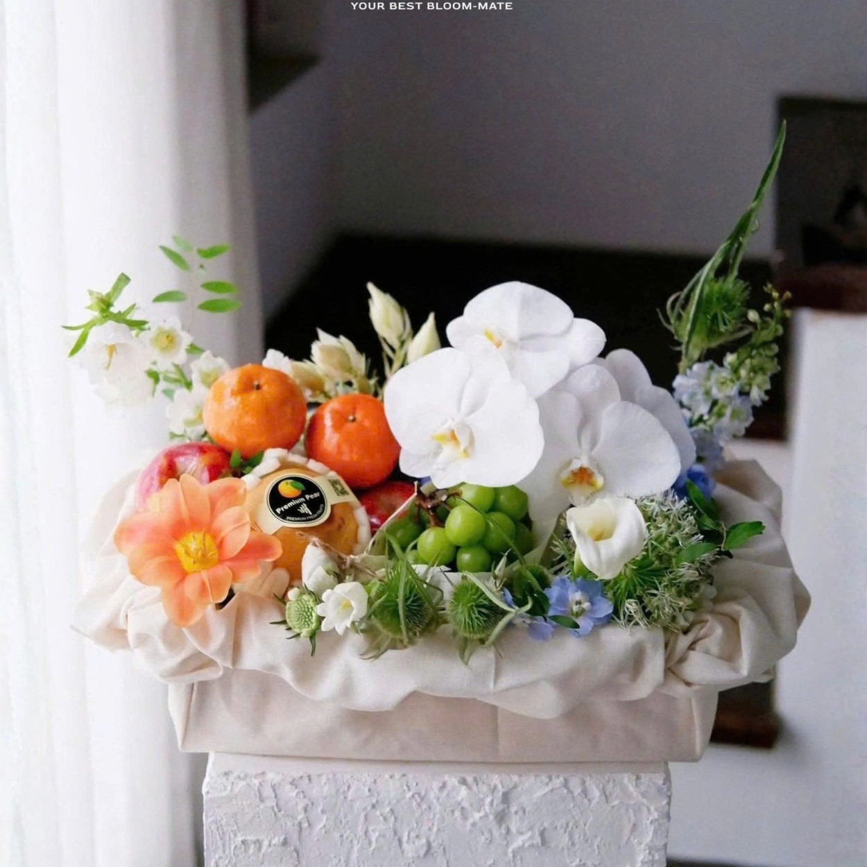 Bản phối gồm cam tươi, nho xanh, táo đỏ – ba sắc độ trái cây chủ đạo – được “neo” bằng cụm lan hồ điệp trắng (điểm nhấn chủ thể) và vài bông tulip nhã thanh. Hệ lá phụ (eucalyptus, nhánh gai xanh, baby nhỏ…) tạo đường viền tự nhiên, giúp khối giỏ thoáng và có chiều sâu. Hộp gỗ vuông vức được phủ lớp vải drape, viền gấp mềm như dải mây, vừa che chắn, vừa nâng tông sang trọng.