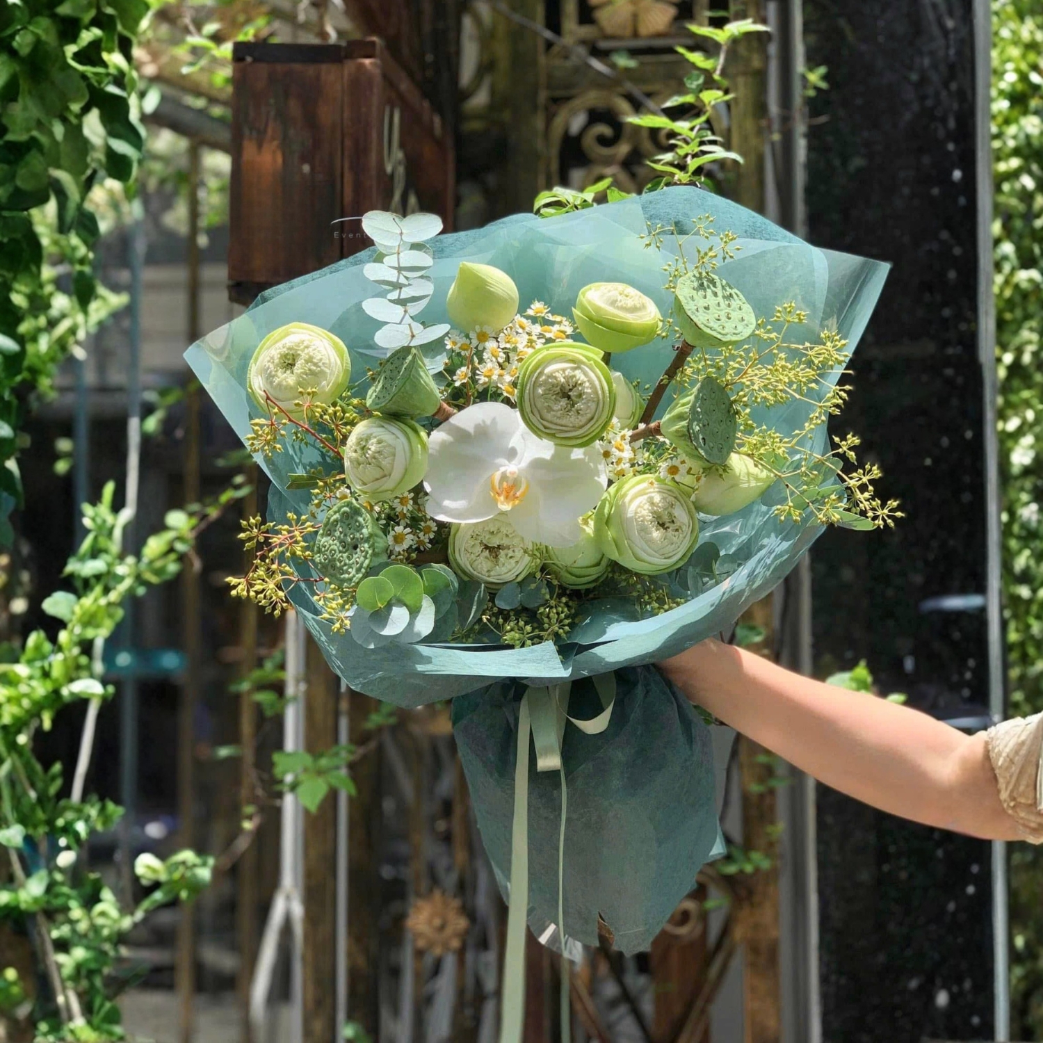 Lấy cảm hứng từ vẻ đẹp thuần khiết, bó hoa là sự kết hợp giữa hoa sen xanh độc đáo, lan hồ điệp trắng tinh khôi và những chùm cúc tana nhỏ xinh. Tất cả được nâng đỡ bởi lá bạc và lớp giấy gói xanh pastel trong trẻo, tạo nên tổng thể nhẹ nhàng nhưng đầy chiều sâu.